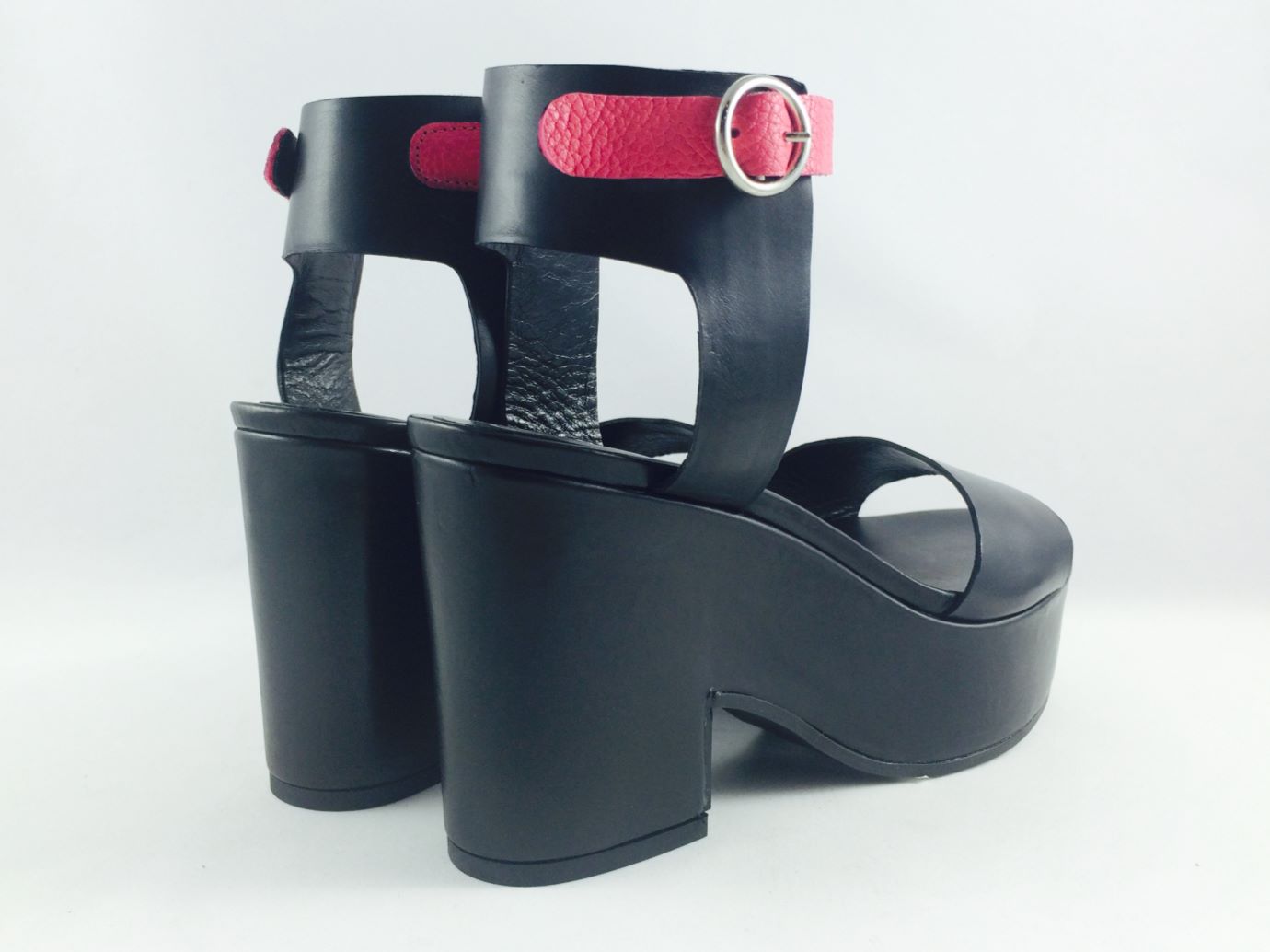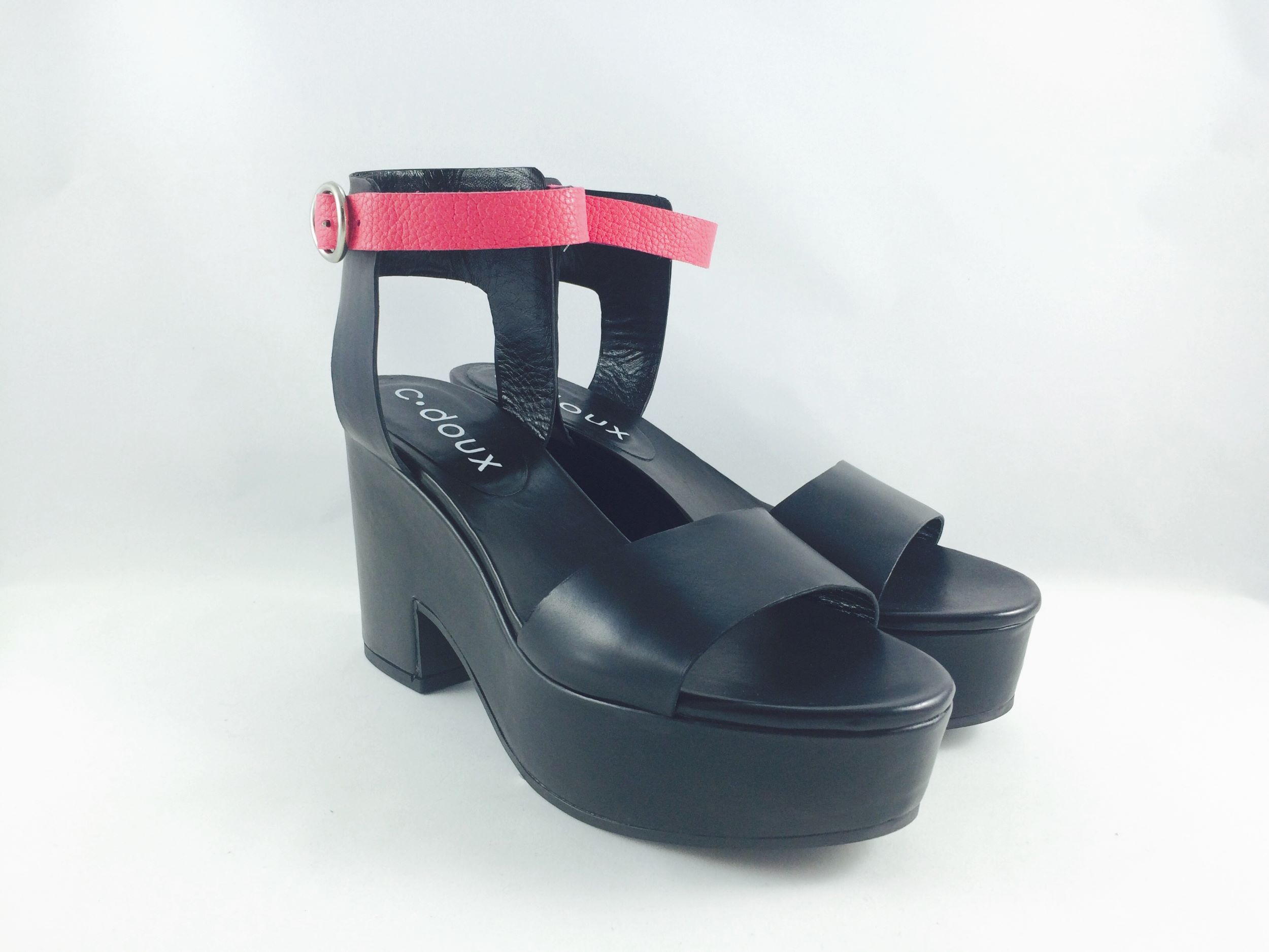 Sandalia de cuña de Cdoux en piel negra y tira de tobillo en ante fucsia, hechas en España (Menorca) de forma artesanal.Comodidad en una altura de 9 cm de tacón y sujeción en el tobillo, con la sensación de llevar el pie prácticamente plano. Suela de goma.